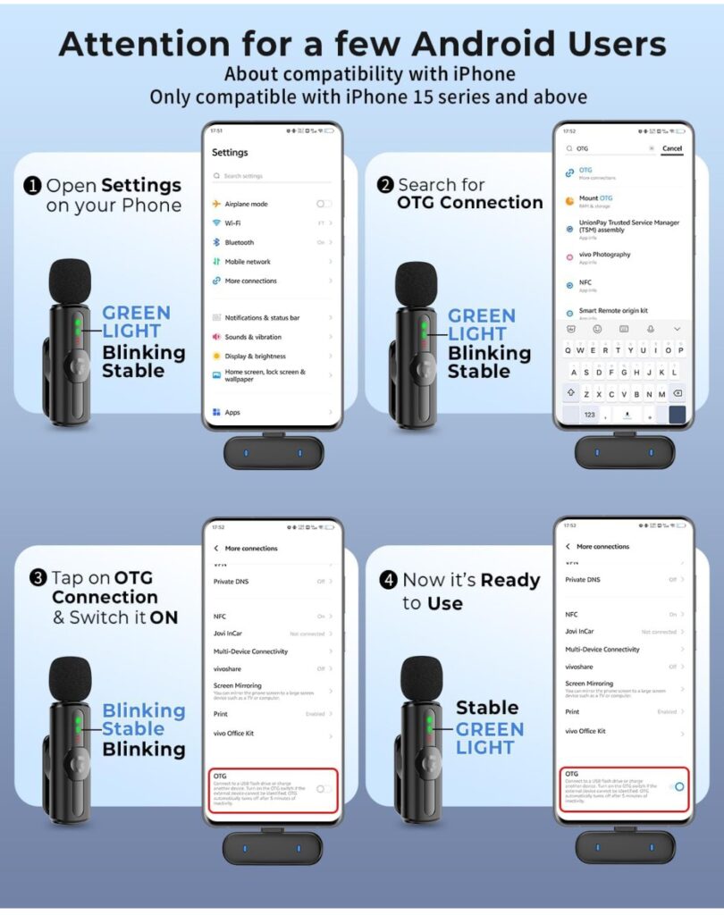 ​Kafi beginners ko setup mein dikkat aati hai, khaaskar Android users ko. Agar aapka mic connect nahi ho raha hai, toh niche di gayi photo ko follow karein Apne phone ki settings mein jaakar ‘OTG Connection’ search karein aur usse ‘ON’ kar dein. Jaise hi mic par green light stable ho jaye, aapka mic recording ke liye ready hai